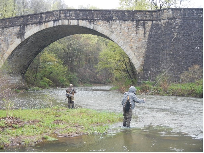 On Saturday, the official start of the outing, the three of us met in the parking lot at the Casselman River Bridge State Park at 9:00 AM. Bob, his wife and daughter and Karan let us know that they were going to arrive later. Weather-wise, Saturday kinda bit the rusty hook when a cold front came through. When we started, the air temperature was about 60 degrees (the temperature dropped during the day) and the sky was overcast with occasional rain making an appearance. The water flow was up and as to be expected, a bit muddy from the rain on Friday. Ken, Lou, and I headed over to Bear Creek to check out that area for the morning. We fished at one of the roadside pull-offs where all three of us had some bites, but no hook-ups. At 1:00 we met the rest of the group back at the historic bridge parking lot for a lunch of grilled hot dogs and beans. We cooked and had lunch in the small pavilion at the State Park and Karan brought a variety of chips to share. After lunch, we headed back out to fish the Casselman. The sky remained overcast, and the air temperature dropped to 46 degrees by the end of the afternoon. Then at 6:00 we all met at the Casselman Inn for dinner. Bob reported that he and his family caught 9 total, plus lost a bunch more. He had a really big fish launch itself in the air and shake the hook out. Their hot fly was a green crystal bugger. The fish were really whacking it and his daughter Grace had a fish leap out of the water after an orange sucker spawn. Bob said that he caught one fat fish that was so wide he couldn’t wrap his hand around it.