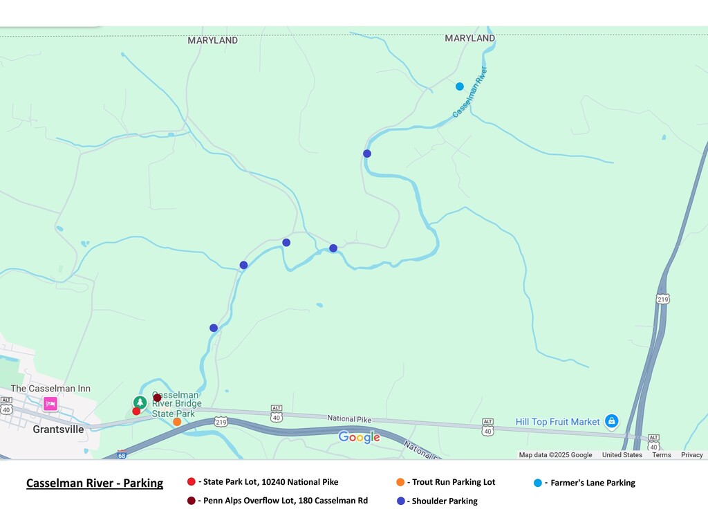 - The last place before the PA line is Farmers Lane (2960-2965 River Rd, Grantsville). Park off the road at the signs and not on the farmer’s driveway! Also be considerate of the Amish horse and buggies and Amish children walking on the road. For those not familiar with the Casselman River, Lou will eventually be at The Farmers Lane (very last place before PA State line) by late afternoon. This is a good place to meet if you are lost and near the end of the day.