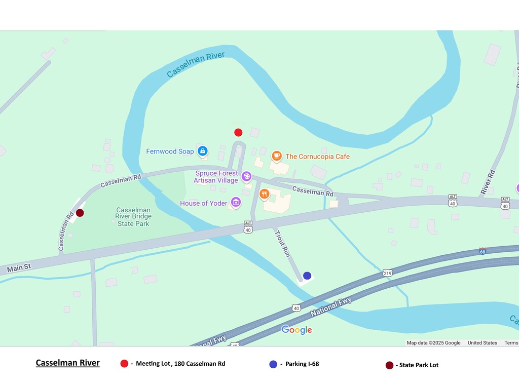 On Saturday morning at 9:00, we will meet at the lower parking area of Penn Alps because the State Park is still closed for bridge construction (see the Casselman-Meeting-Map). Why so early? The Casselman can get crowded, and all the pull-offs can be full. If you are coming late, let me know by text or email so that I can keep track of people.