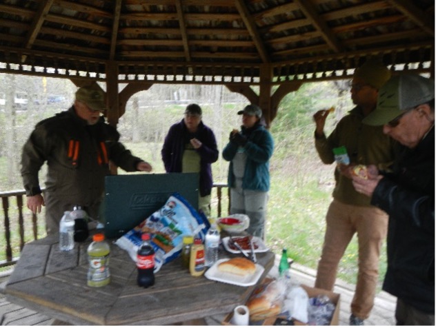 On Saturday, the official start of the outing, the three of us met in the parking lot at the Casselman River Bridge State Park at 9:00 AM. Bob, his wife and daughter and Karan let us know that they were going to arrive later. Weather-wise, Saturday kinda bit the rusty hook when a cold front came through. When we started, the air temperature was about 60 degrees (the temperature dropped during the day) and the sky was overcast with occasional rain making an appearance. The water flow was up and as to be expected, a bit muddy from the rain on Friday. Ken, Lou, and I headed over to Bear Creek to check out that area for the morning. We fished at one of the roadside pull-offs where all three of us had some bites, but no hook-ups. At 1:00 we met the rest of the group back at the historic bridge parking lot for a lunch of grilled hot dogs and beans. We cooked and had lunch in the small pavilion at the State Park and Karan brought a variety of chips to share. After lunch, we headed back out to fish the Casselman. The sky remained overcast, and the air temperature dropped to 46 degrees by the end of the afternoon. Then at 6:00 we all met at the Casselman Inn for dinner. Bob reported that he and his family caught 9 total, plus lost a bunch more. He had a really big fish launch itself in the air and shake the hook out. Their hot fly was a green crystal bugger. The fish were really whacking it and his daughter Grace had a fish leap out of the water after an orange sucker spawn. Bob said that he caught one fat fish that was so wide he couldn’t wrap his hand around it.