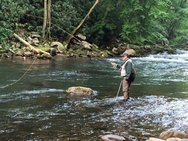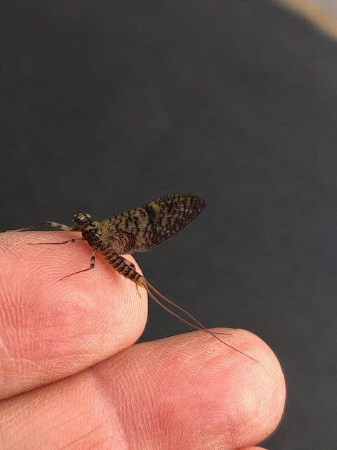 Arrived on Friday and started at the PHD pool with march brown mayflies hatching. Very little, to no fish activity. We all moved down stream below the Alleghany swinging bridge and fished towards and into the evening. I noticed mayflies and caddis flying around and birds swooping down grabbing the insects in flight. Ken was quickly on a brown using a daddy long leg (or crane fly). Across the stream I could see some trout rising to insects near the rocks on the bank. The current was swift on some places and proper casting and mending were required. I had multiple hits on a renegade, but unable to hook the trout due to excess mending line and slack leader. However I was proud of myself with some good presentations and able to catch 2 good browns in the 12” range. I could see their nose come up and grab the renegade without any splash. One trout had a last run just before the net and got into swift water and was gone. I still had the renegade which I tied in Bob Dietz fly tying class.